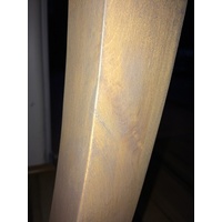 Elegant dining or bedroom chair has been upholstered in Denim Blue linen and features a silver ring pull handle on the back of the chair. This chair has natural coloured legs with a french grey wash. Warranty: 1 year - under fair domestic use condition.